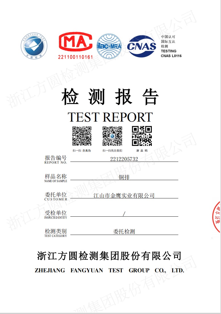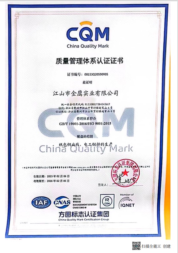 江山市金鷹實業有限公司,地處江山市賀村工業園區趙家山4-1號,占地面積18000M2,建筑面積約15000 M2。原主要生產、銷售“金鷹、金盾、JYD”系列地彈簧產品,是國內唯一二次參與制訂地彈簧國家標準的專業生產廠。企業曾榮獲“省級先進企業、文明單位”等殊榮。所生產的系列地彈簧產品,被國家及省有關部門評定為“省優產品、質量信得過放心產品、高標準嚴要求制造產品”等稱號。并于2002年通過了“ISO9002方圓質量體系認證”。隨著國內用電水平的不斷提高及高低壓電網改造的需要,公司及時捕捉市場對電工銅排和紙包繞組銅扁線需求的機遇。通過自籌資金,改建廠房,新購成套先進生產、檢測設備。建成了目前國內自動化程度最高,加工精度最優的電工銅排和紙包繞組銅扁線生產線。